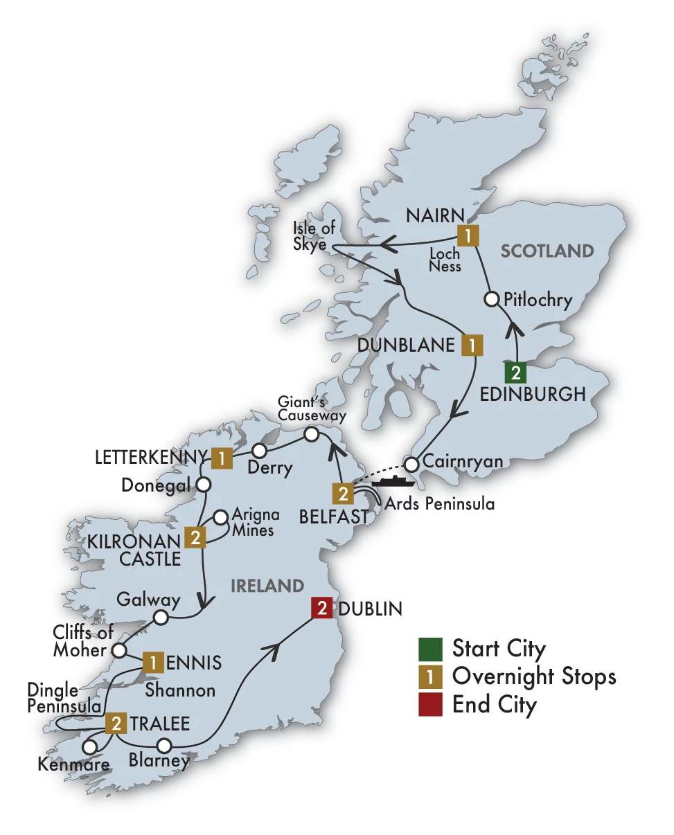 Tour Stirling Castle, perched on volcanic rock above the town, and explore the richness of this 16th-century palace that was once home to Mary, Queen of Scots. Drive on through southwestern Scotland to Cairnryan and board the ferry to Belfast, where you’ll dine at your hotel this evening. (B, D)