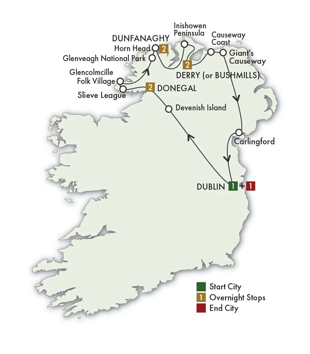 Depart Antrim and head back to Dublin. Along the way, stop in the historic town of Carlingford, known for its fresh seafood, scenic views, and leprechaun folklore. Stroll through the charming town center, exploring the medieval streets lined with colorful shops and pubs, then have lunch in a local café. Continue on to Dublin and bid farewell to your guide. Your evening is free to dine and explore as you wish. Walk details: about 1 hour, 2 miles (3 km). (B, L)