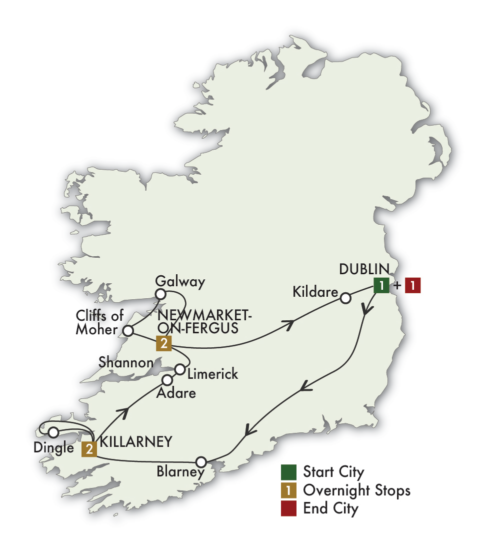 Discover the glorious Dingle Peninsula; the rugged coastline provides some of Ireland’s most spectacular vistas. Travel to Slea Head at the westernmost tip of the peninsula for awesome views of the Atlantic Ocean. Enjoy an evening of traditional Irish entertainment over dinner at Muckross Schoolhouse. (B, D)