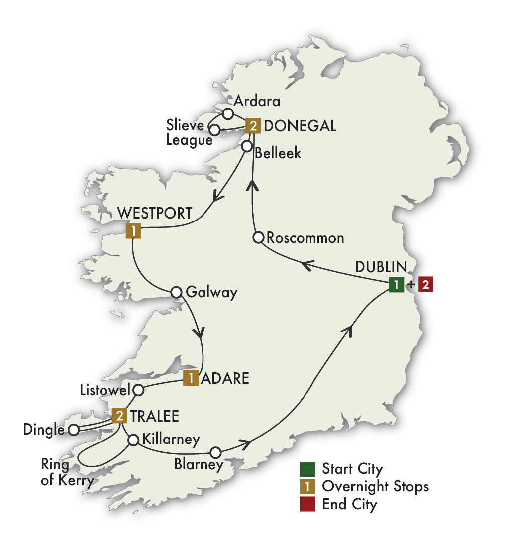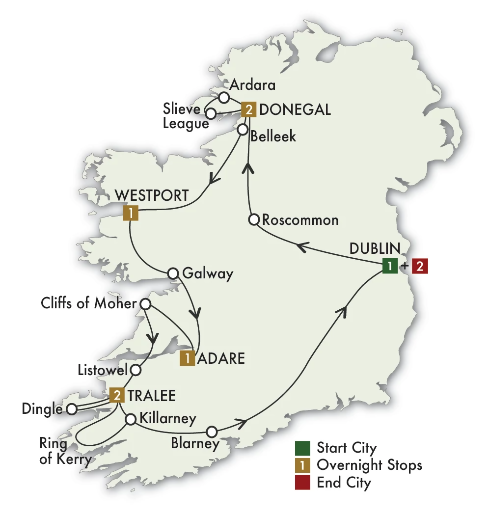 Embark on a tour of the Ring of Kerry, Ireland's most famous and popular scenic drive. Stop at Moriarty's in the beautiful Gap of Dunloe, a CIE Tours preferred shopping partner. Continuing on the scenic drive, pause for panoramic mountain views at Moll's Gap. Stop at Atlantic Irish Seaweed for a guided walk along the shoreline and enjoy a few seaweed nibbles. Visit Killarney for free time to explore before returning to Tralee, where you may dine as you wish. (B)