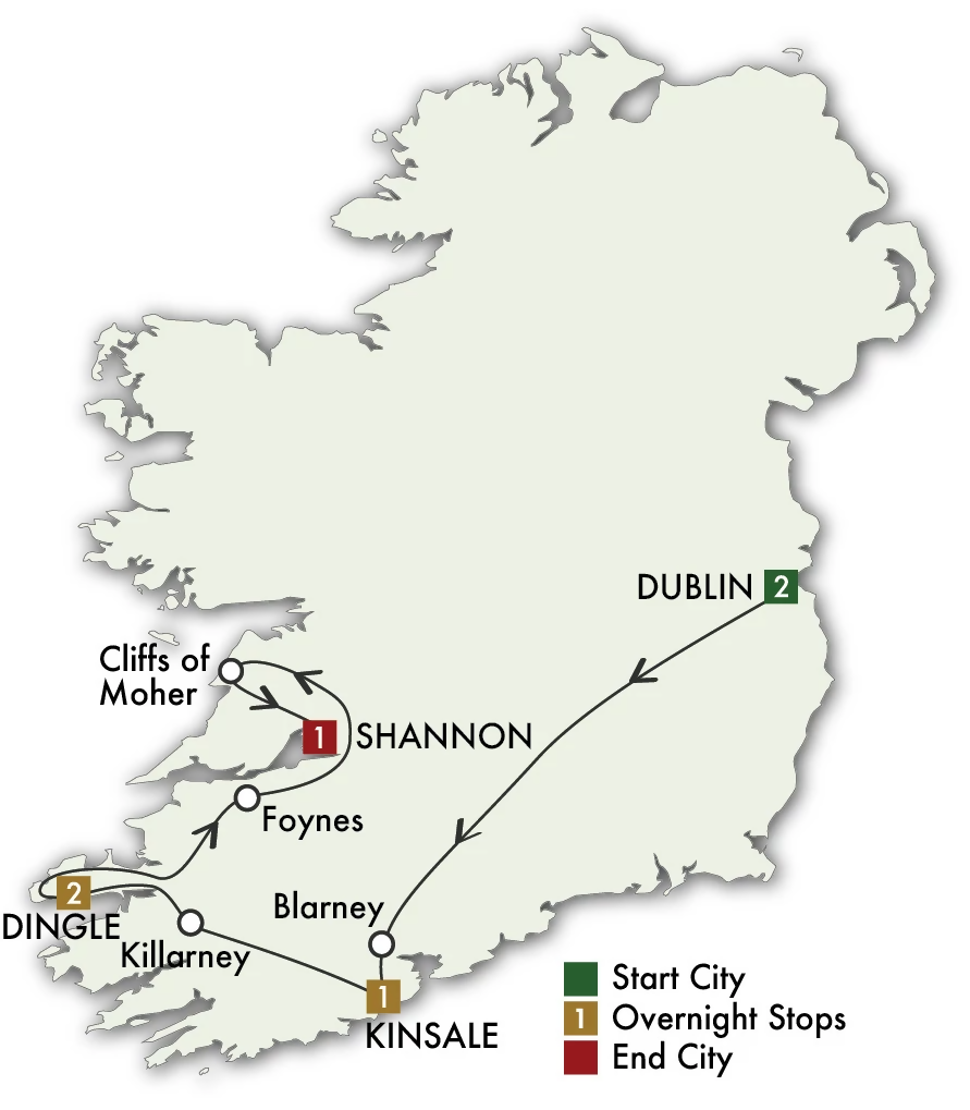 Travel to Blarney Castle; climb the winding staircase to kiss its famous stone or enjoy the gardens. Go to Kinsale, a picturesque old fishing town known for art galleries and gourmet food. Join a local guide for a fascinating walk around its historic streets, once besieged by the Spanish Armada, before dinner at your hotel. (B, D)