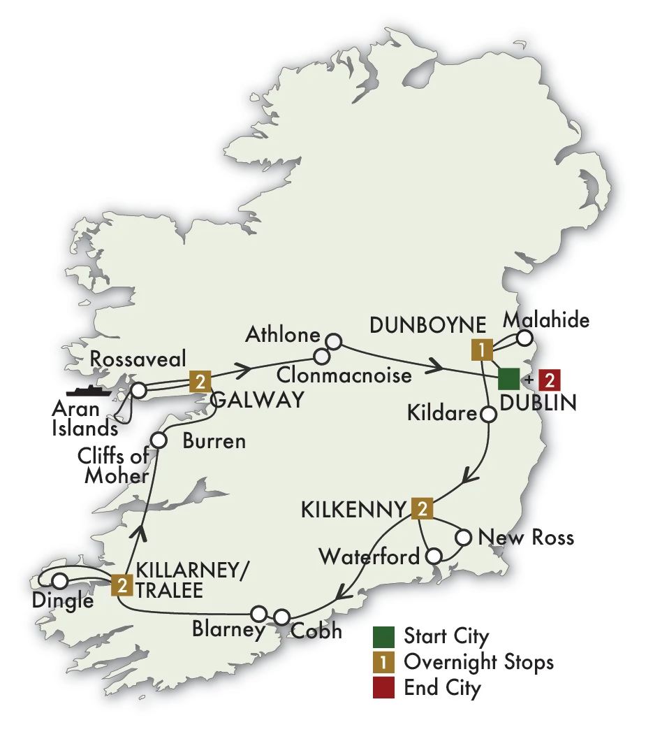 - 9 Breakfasts (B), 2 Lunches (L) and 6 Dinners (D), including a welcome dinner at Dunboyne Castle Hotel.