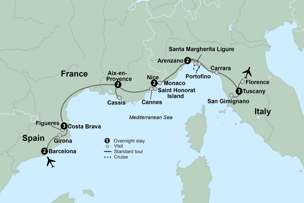 You’re on your way to the Mediterranean coast for a journey connecting the Spanish, French, and Italian Rivieras. From chameleonic Barcelona to sun-kissed Nice, and from the splendor of Provence to the rolling hills of the Tuscan countryside, embark on a coastal journey combining rich scenery, art, culture, food, and wine.