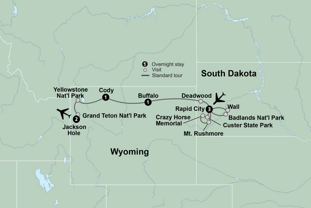 Enjoy stunning views of the American West as you make your way through Yellowstone, Grand Teton National Park, and more. Overnight in the cowboy towns of Jackson Hole and Cody. Experience the Wild West as it once was with a visit to Deadwood, a town built on gold and gunpowder. Choose how you delve into the local history, with a tour of the Adams Museum in Deadwood or at the exhibit Tatanka: Story of the Bison. Experience Yellowstone National Park, home to an incredible array of wildlife. Search for free-ranging herds of buffalo in Custer State Park. Marvel at Grand Teton National Park’s towering peaks, marked with mountain glaciers. Soak in stunning views of Mt. Rushmore and the Crazy Horse Memorials. Grab your Stetson hat and saddle up for an adventure as you discover natural wonders and cultural treasures.