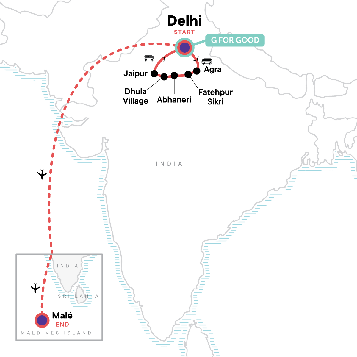 Your Welcome Moment: Meet Your CEO and Group. Women on Wheels arrival transfer. Old Delhi walk with stops at the Jama Masjid, Gurduwara, Chandni Chowk, and Connaught Place. Agra Fort visit. Taj Mahal visit. Fatephur Sikri visit. Village stay. I'timad-ud-daulah (Baby Taj) entrance. Jaipur City Palace entrance and guided tours. Amber Fort. Abhaneri stepwell visit. Flight between Delhi and Malé. Transfer from Malé airport to dhoni pick-up point. Fulidhoo Island visit and Bodu Beru performance. Felidhu Island visit. Bodu Mora Island visit. Snorkelling equipment. Beach time in the Maldives. Seven days aboard a traditional dhoni boat. All transport between destinations and to/from included activities.