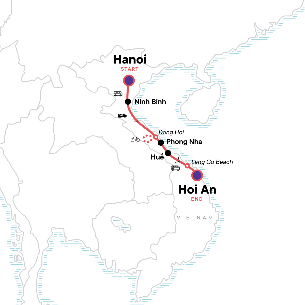 Your Welcome Moment: Meet Your CEO and Group. Hanoi Foodie Culture Tour. Tam Chuc Pagoda Tour. Dong Hoi Wet/Fish Market tour and countryside cycling. Vinh Moc Tunnels Tour. An Bang Cemetary Tour. Visit Lang Co Beach. Hai Van Pass and Marble Mountain Tour. Hoi An Old Town Walk and Riverside Evening Out. All transport between destinations and to/from included activities.